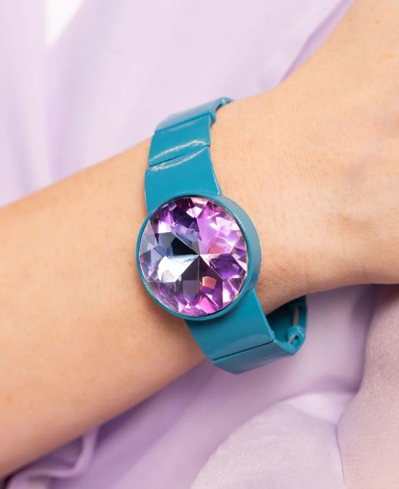 Featuring a UV shimmer, an exaggerated purple gem is pressed into a metallic blue fitting along bold rectangular frames around the wrist on stretchy bands for a colorful summer look.