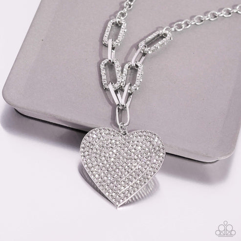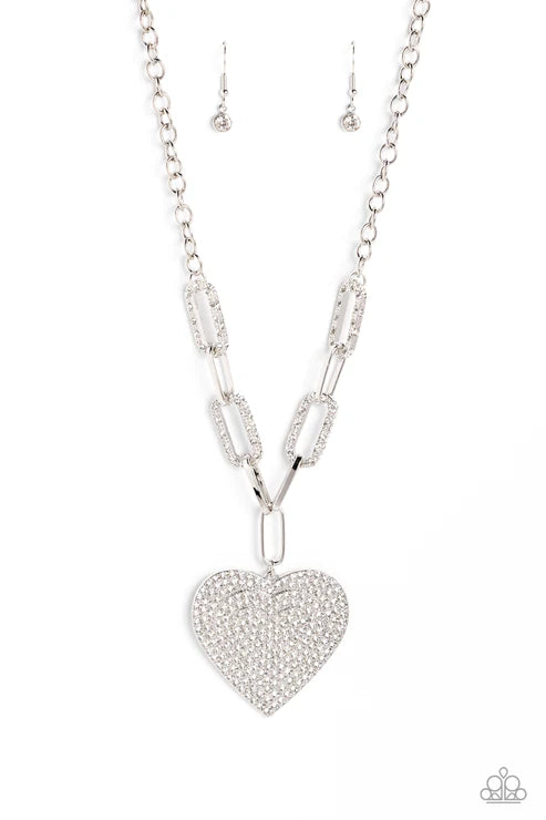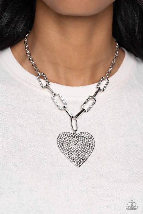 Elongated, oversized silver links, encrusted with a blinding display of white rhinestones and shimmery silver accents, connect a classic silver chain to an exaggerated silver heart pendant for a romantically refined finish. Featured on the oversized silver heart, layers upon layers of glitzy white rhinestones emboss across its entire surface as the hearts gradually increase in size from the center. Features an adjustable clasp closure.