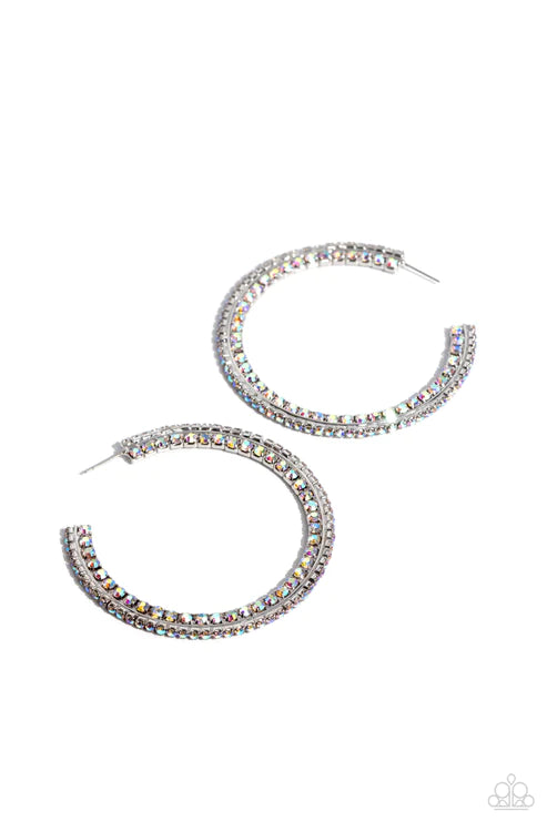 Glittery iridescent rhinestones are encrusted along the front and side of a textured tread-like oversized silver hoop for a sassy finish. Earring attaches to a standard post fitting. Hoop measures 2 1/2" in diameter. Due to its prismatic palette, color may vary.
