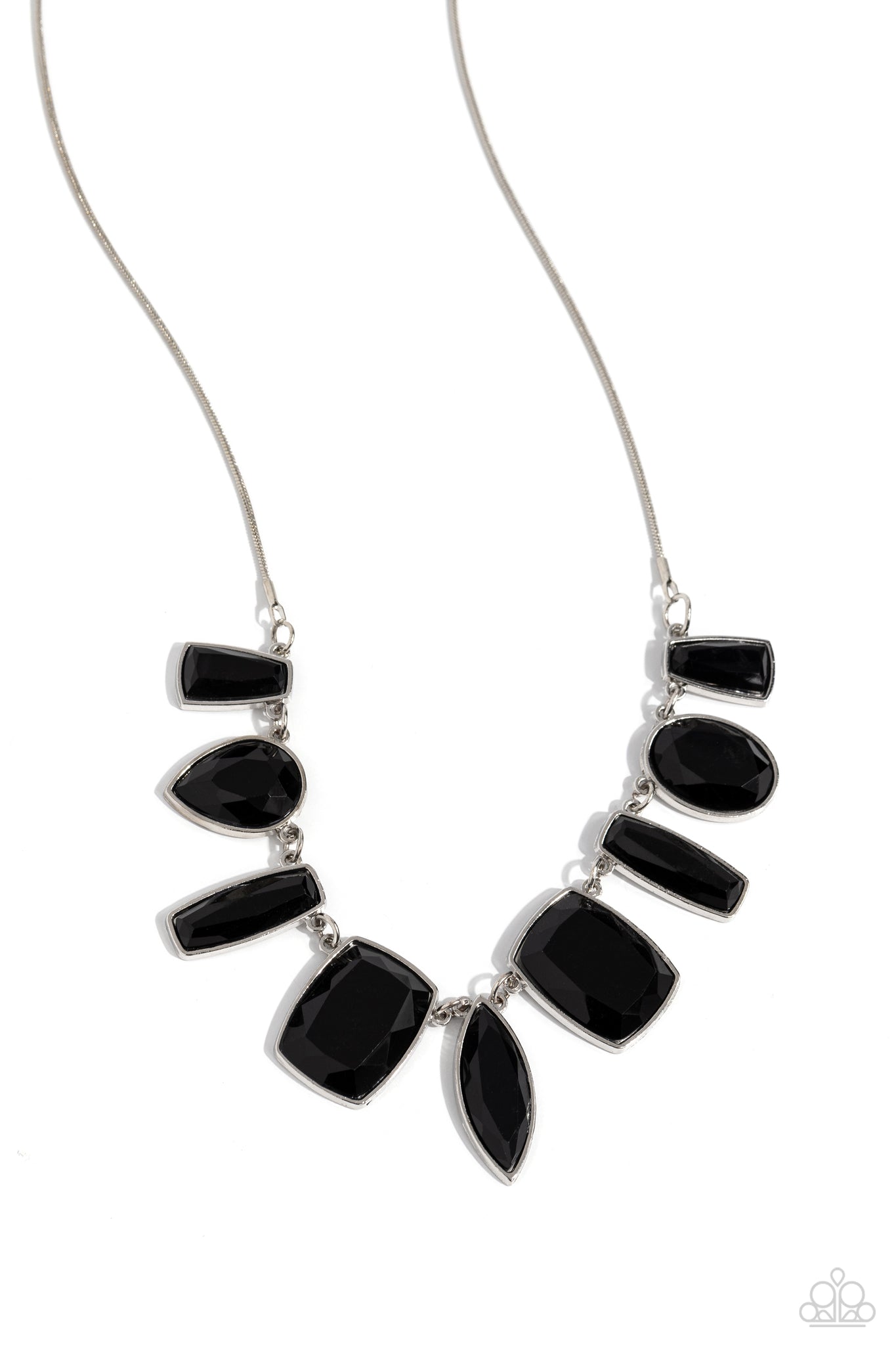 Encased in sleek silver fittings, a faceted assortment of teardrop, marquise, and emerald cut black beads fan out below the collar for a bold pop of color. Features an adjustable clasp closure.