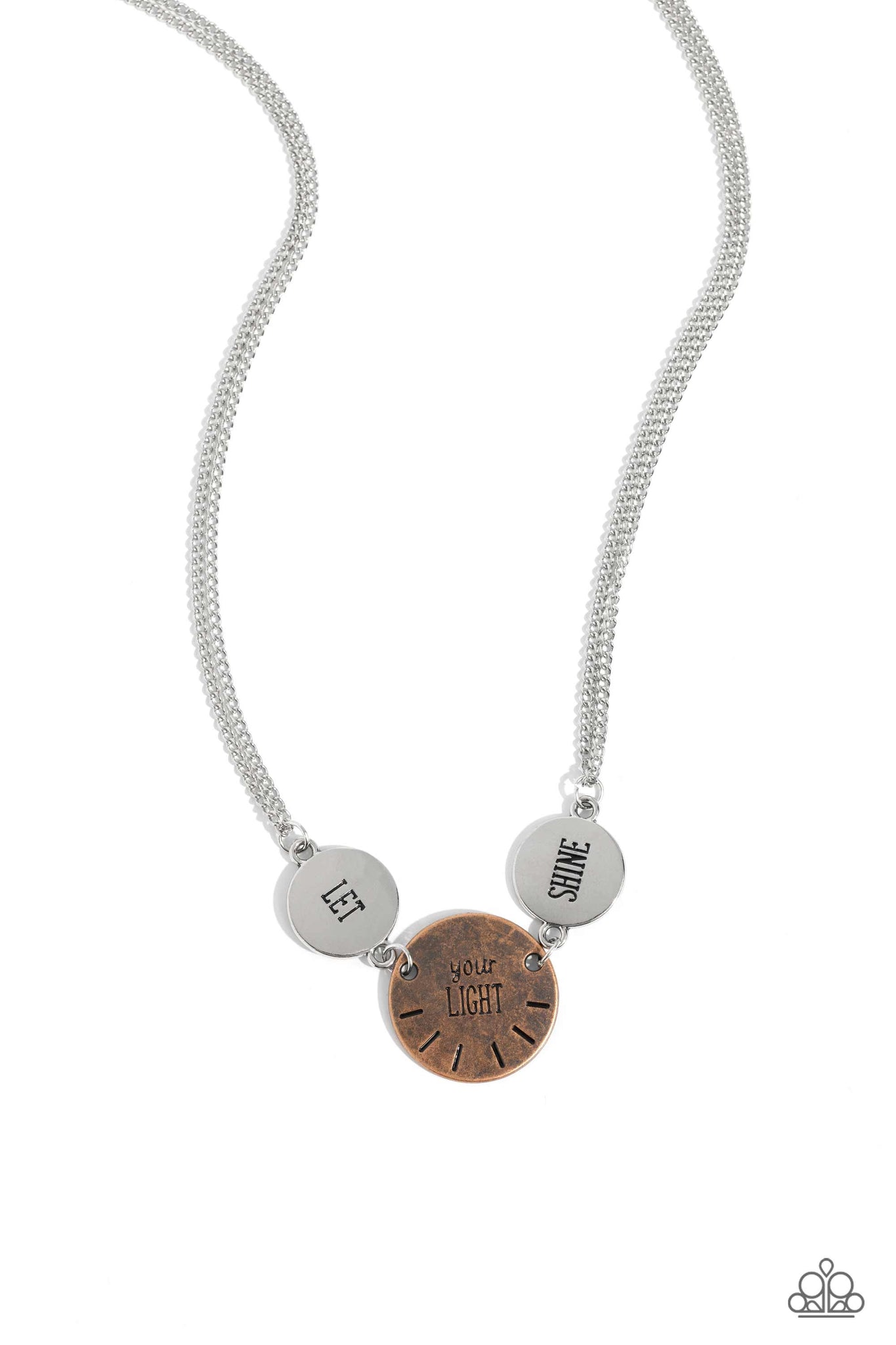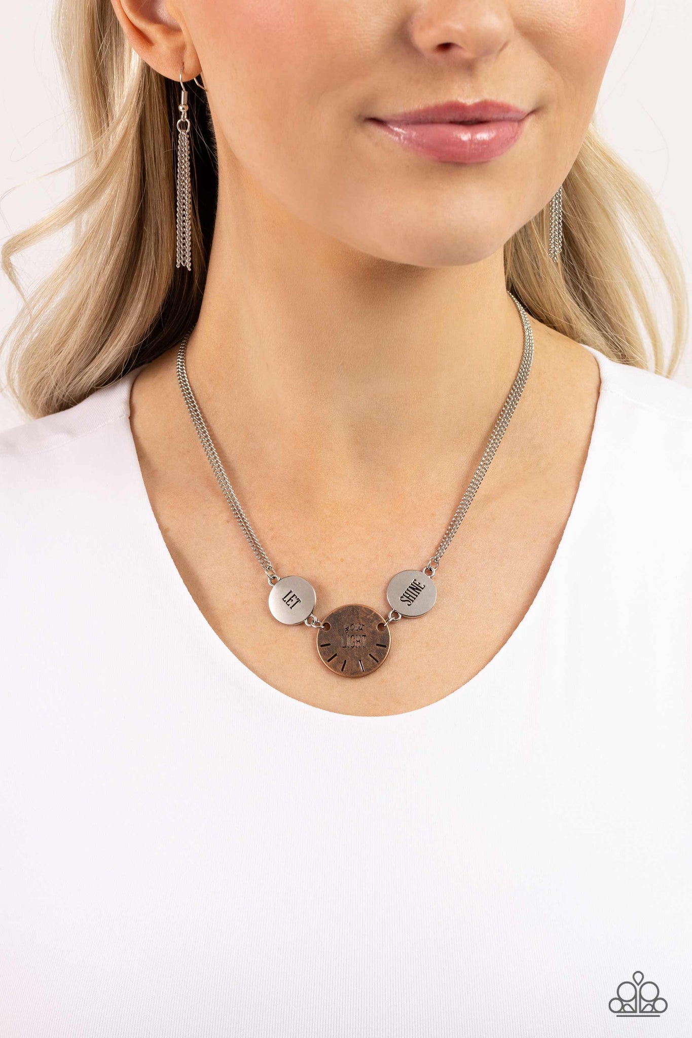 Individually stamped in "Let," "Your Light," Shine," a pair of shiny silver discs links with a single copper disc, combining into an inspirational phrase below the collar. Features an adjustable clasp closure.