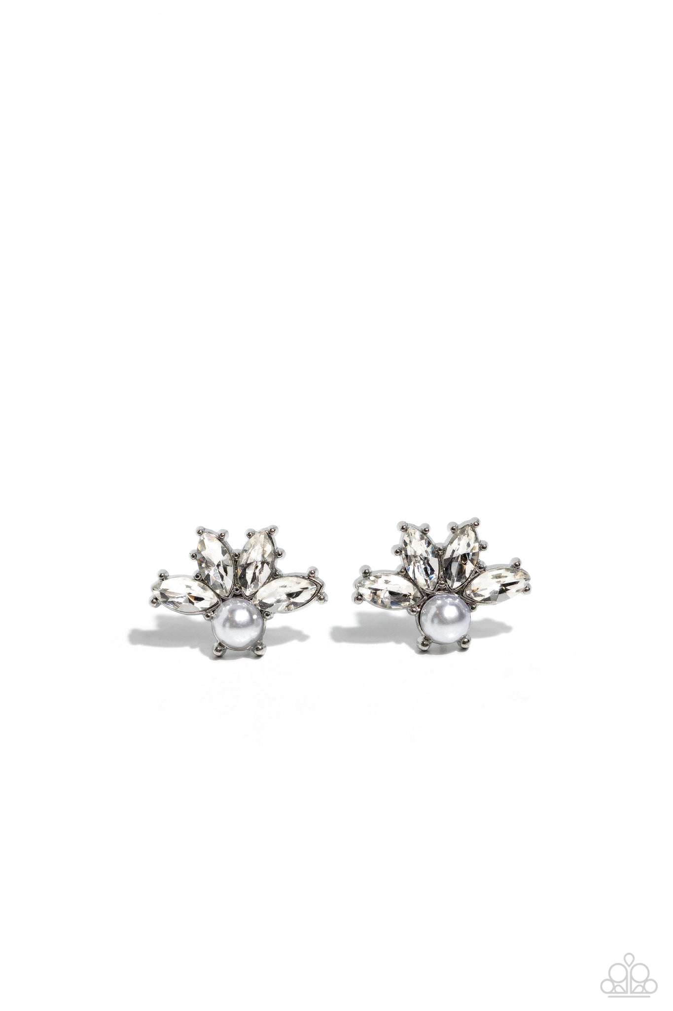 Encased in pronged silver fittings, marquise cut rhinestones fan out from the bottom of a dainty pearl for a vintage inspired fashion. Earring attaches to a standard post fitting.