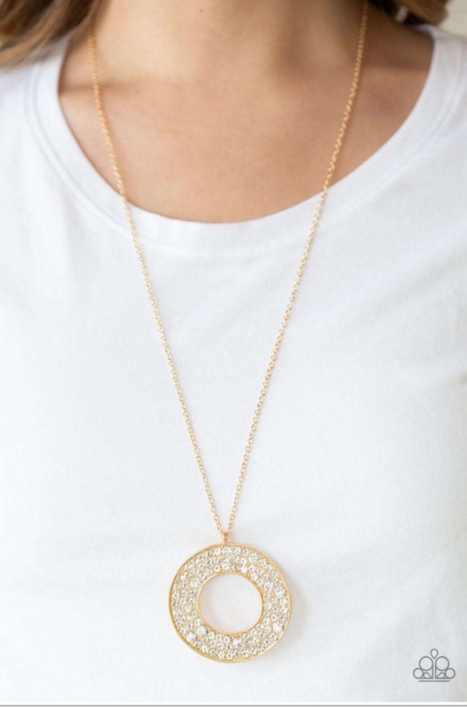 Encrusted in row after row of glittery white rhinestones, an oversized round pendant swings from the bottom of a lengthened gold chain for a blinding look. Features an adjustable clasp closure.